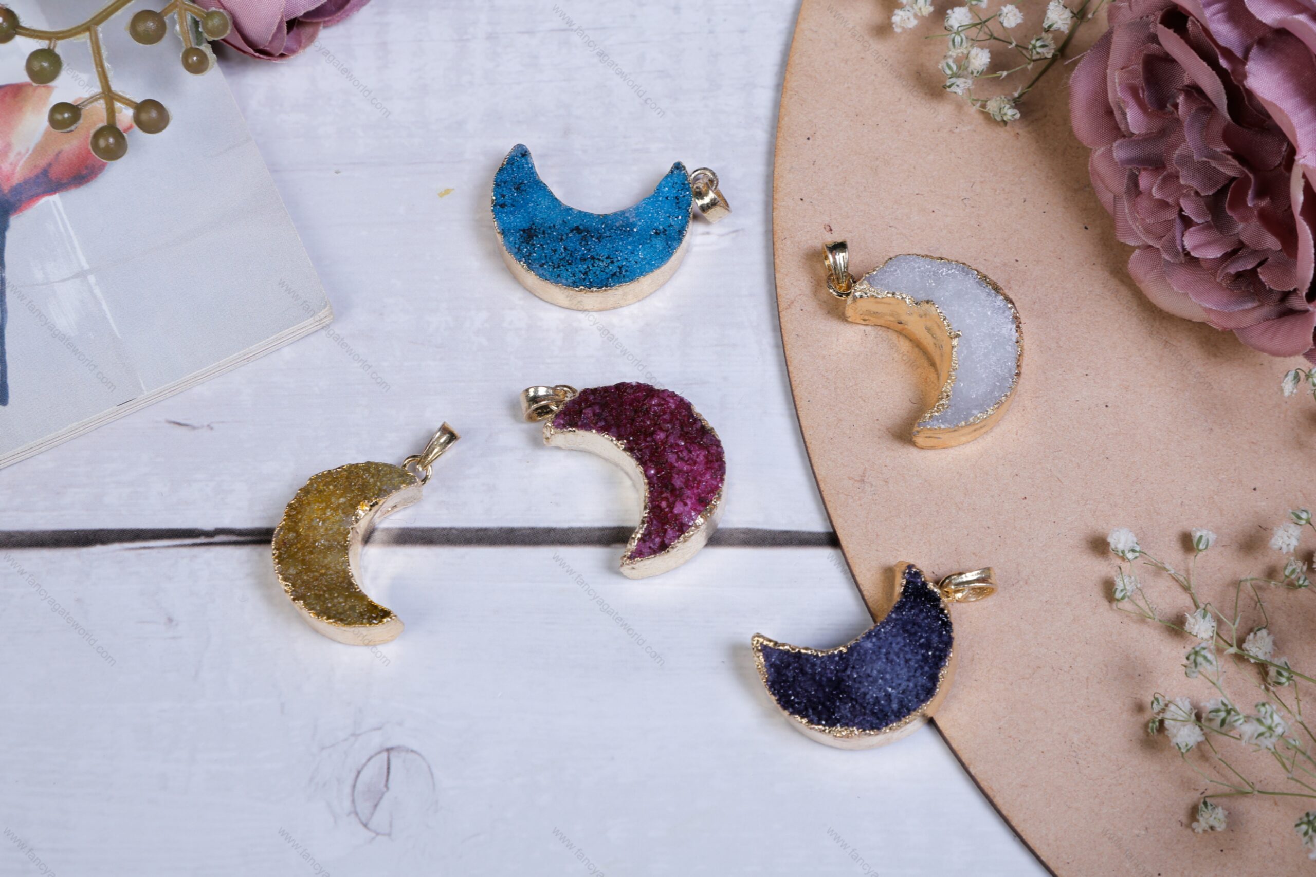 Agate Druzy Moon Shaped Pendants